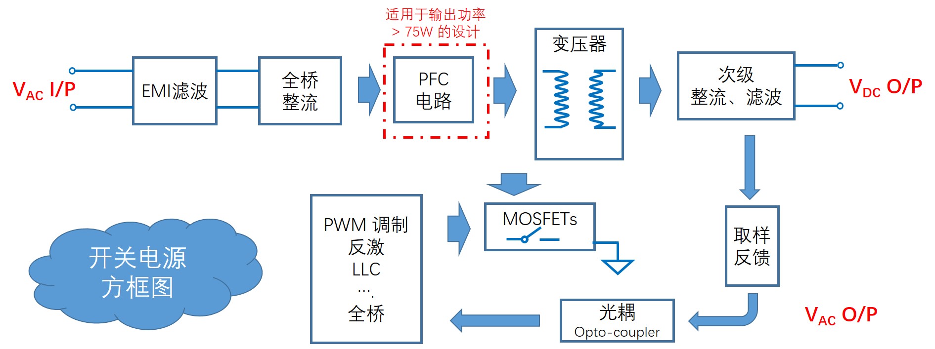 開關(guān)電源主要由防浪涌電路、電磁干擾濾波電路(EMI)、初級整流濾波電路、功率因數(shù)校正電路(PFC)、PWM 控制電路、功率轉(zhuǎn)換電路、輸出整流濾波電路、取樣反饋電路和保護電路等組成。