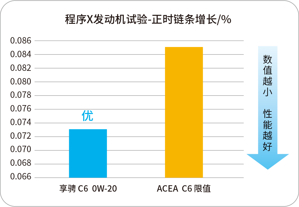 采用日本【ENEOS株式會社】精選的全合成基礎(chǔ)油和添加劑技術(shù)調(diào)配,具有超凡的清潔分散性和優(yōu)異的抗磨保護(hù)性能,有效保護(hù)正時鏈條、緩解低速早燃,持久激發(fā)愛車的動力性能,尤其適用搭載渦輪增壓缸內(nèi)直噴發(fā)動機(jī)的國六及以下車輛。